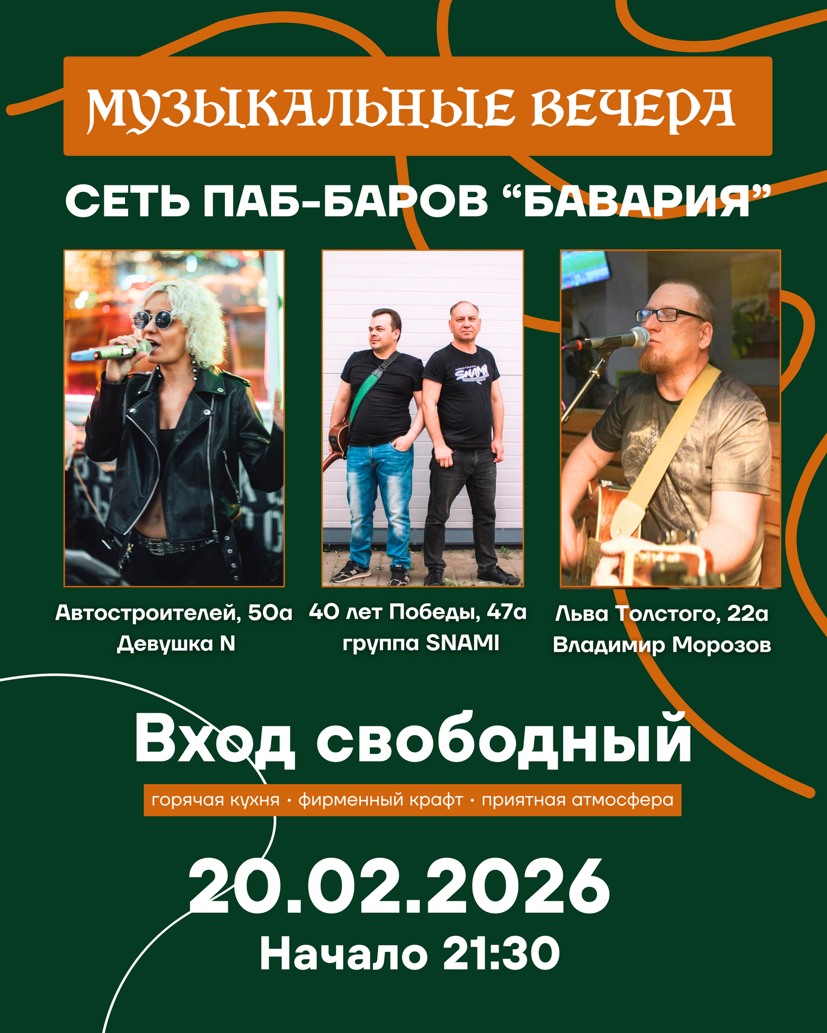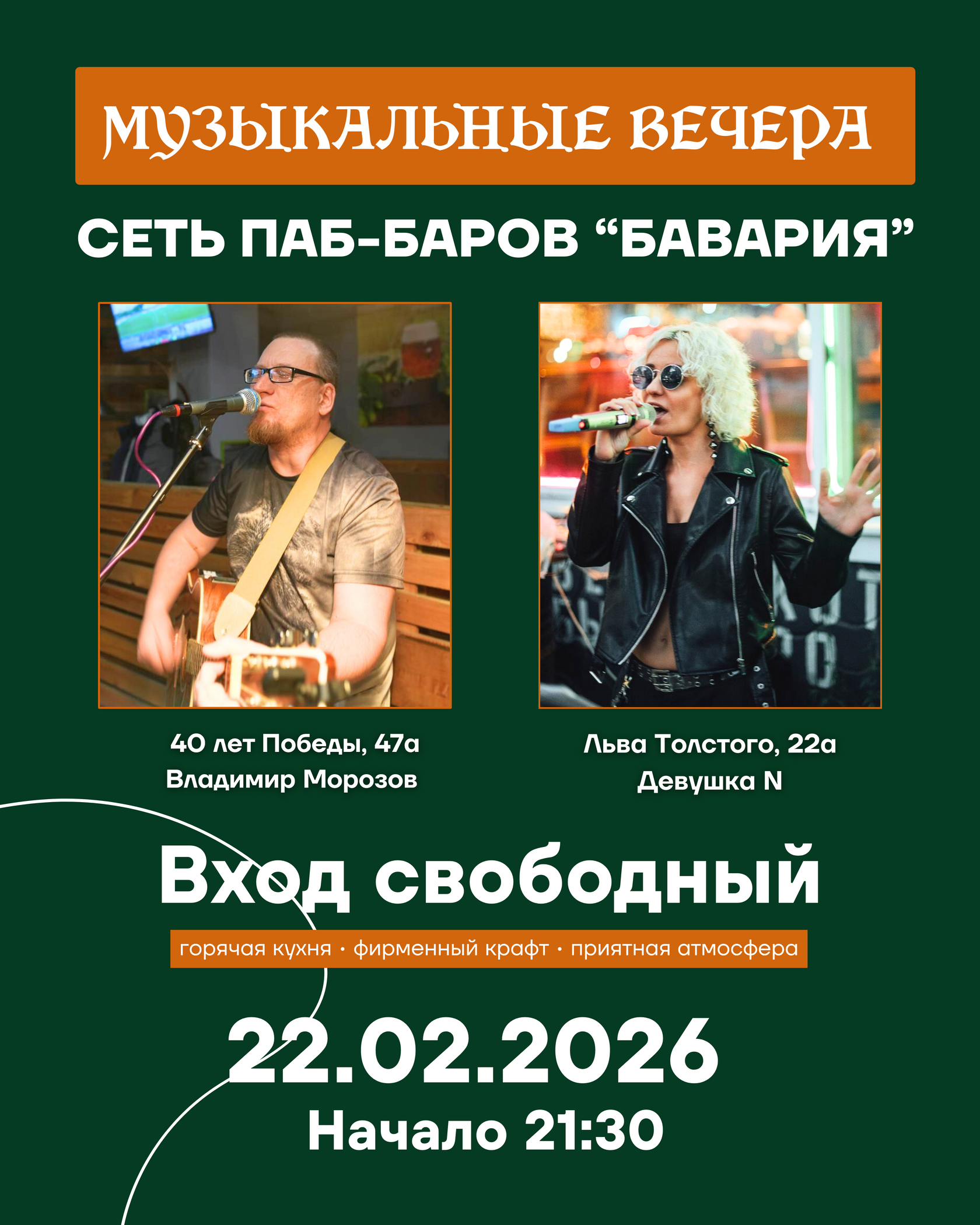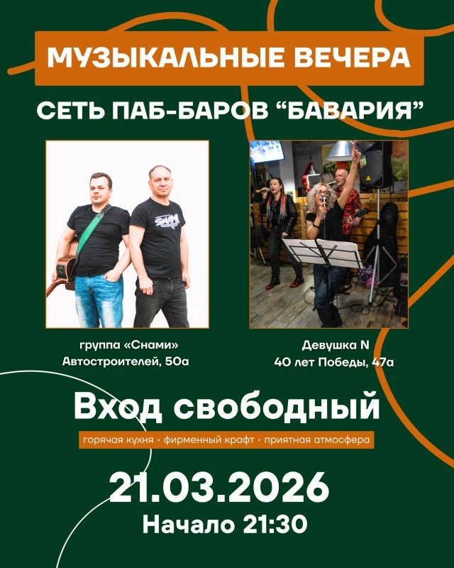 Вечером работает кухня в полном объёме: горячие мясные блюда, закуски к вину и фирменные позиции, которые гости заказывают снова и снова. В баре — всегда свежий крафт и любимые напитки. Живая музыка, тёплый свет, плотный звук и та самая атмосфера, ради которой возвращаются.